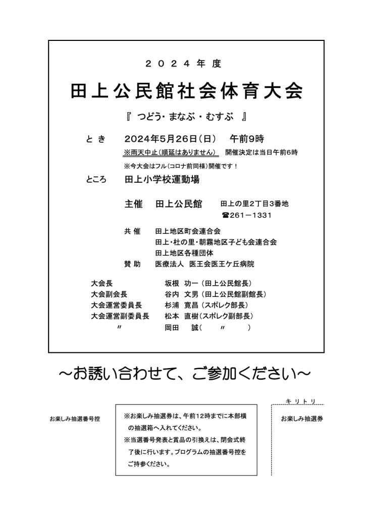 | 5月 | 26(日) | (ス)社会体育大会 | 田上地区自主防災会総会 |