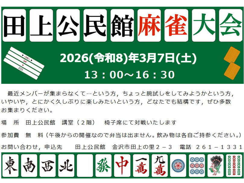 3月7日土曜日午後1時から麻雀大会を開催します。詳しくはチラシをご覧ください。